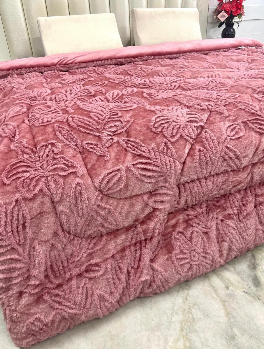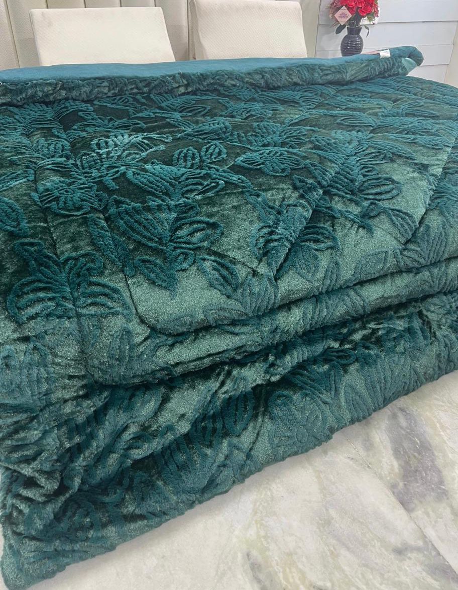 1 SUPER-LUXURIOUS CUTLOOK-EMBOSSED IMPORTED DOUBLE SHINE SUPER-HEAVY GSM RABBIT FURR DOUBLE BED REVERSIBLE QUILT/RAJAI { 90x100INCHES }